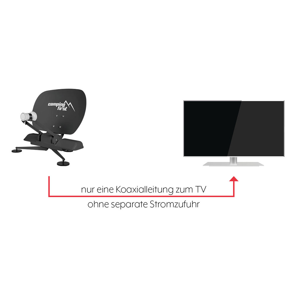 Die Inbetriebnahme der Satmex mobil 3 ist besonders unkompliziert. Es wird nur eine Koaxialleitung zum Fernseher oder Satelliten-Receiver benötigt – eine separate Stromversorgung ist nicht notwendig. Die Antenne wird direkt über das angeschlossene Gerät mit Strom versorgt.