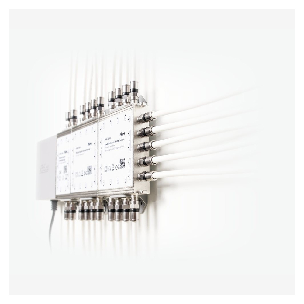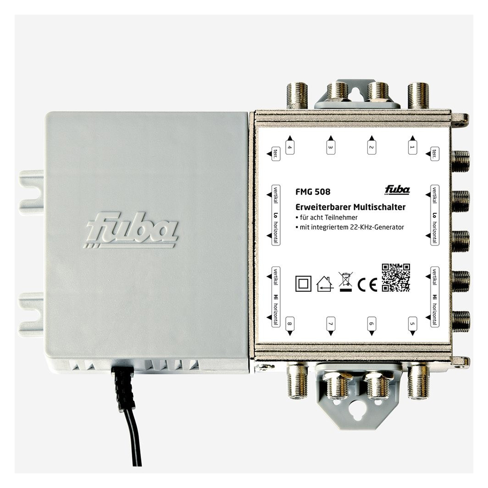 Der Fuba FMG 508 ist ein erweiterbarer Multischalter und für die Verteilung von Satelliten-Signalen und terrestrischen Fernseh- und Radio-Signalen in Hausinstallationen onzipiert. Er dient sowohl zum Anschluss von Quattro-LNBs als auch von Quattro-Switch-LNBs. Die Grundeinheit FMG 508 ermöglicht die Verteilung des Satelliten-Signals an bis zu 8 Teilnehmer; mit Einbeziehung der Multischalter-Erweiterungen FME 504 und FME 508 sind bis zu 32 bzw. 48 Empfänger möglich
