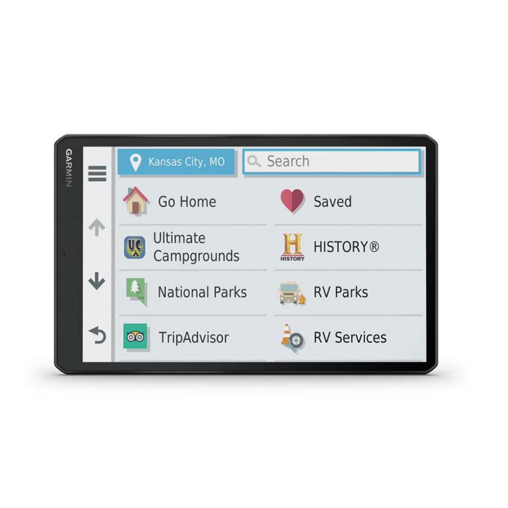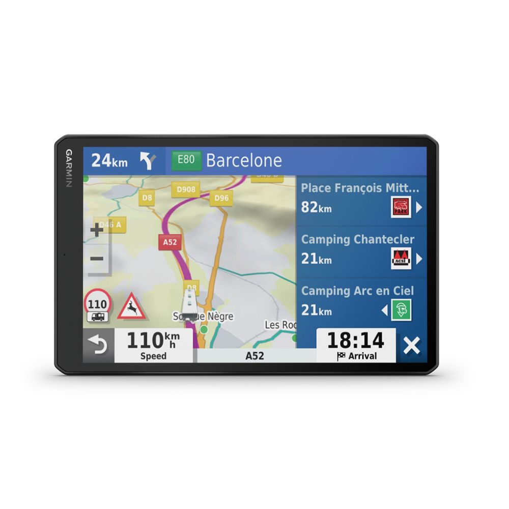 Spezifische Garmin-Navigation für Freizeitfahrzeuge mit Sprachsteuerung, spezifische Routenführung unter Verwendung von Fahrzeugmaßen und Gewicht, Warnfunktionen und Sonderzielen.