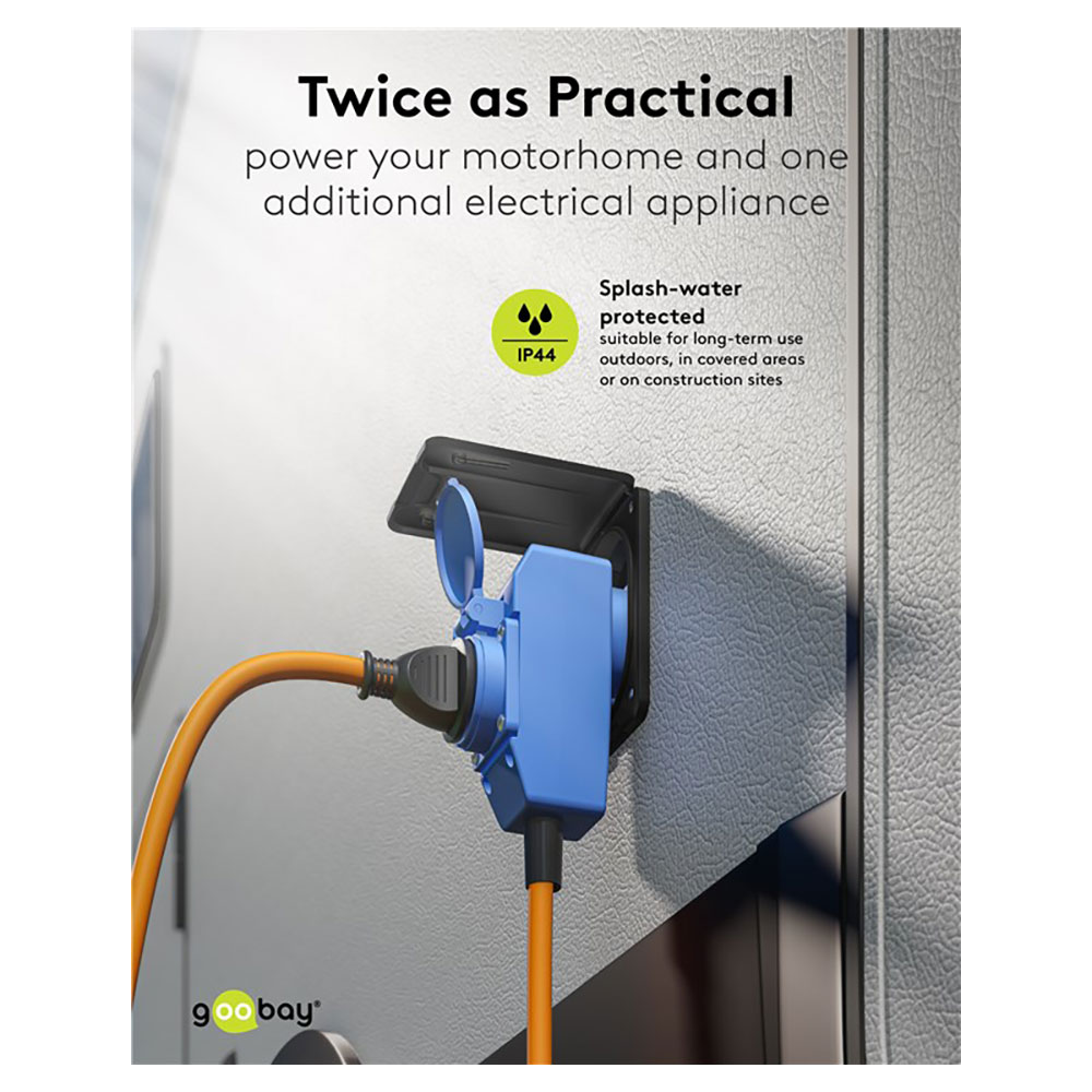 - Mit der Winkelkupplung lässt sich komfortabel ein zusätzliches Gerät mit Schutzkontakt von außen am Wohnmobil anschließen – platzsparend um 90° abgewinkelt