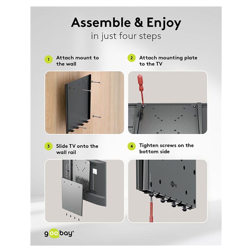 - Montagefreundlich: Im ersten Schritt wird der Fernseher an die Montageplatte geschraubt und im zweiten Schritt über die zuvor angebrachte Wandschiene geschoben