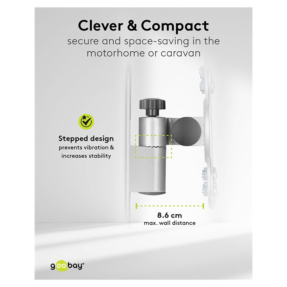 Mit der praktischen Wandhalterung verwandelt sich das Wohnmobil in ein mobiles Heimkino: Fernsehen, Filme und Streaming auf bis zu 43 Zoll Bildschirmdiagonale sorgen ab sofort auch unterwegs und im Urlaub für Entertainment. Für den sicheren Transport wird die Aufhängung einfach per Feststellschraube arretiert – für zuverlässigen Halt und ohne störende Vibrationsgeräusche während der Fahrt.