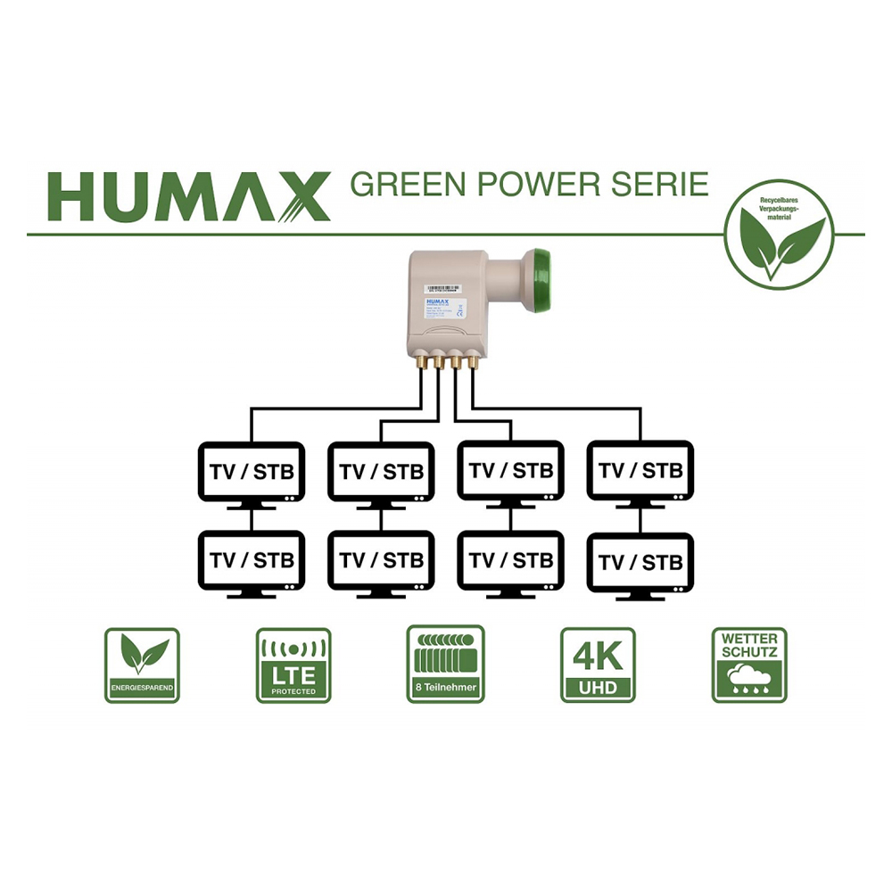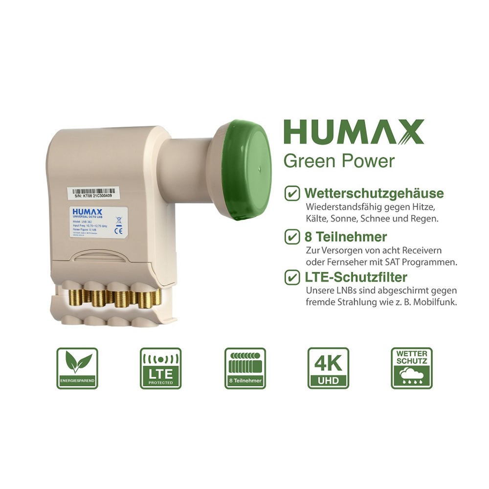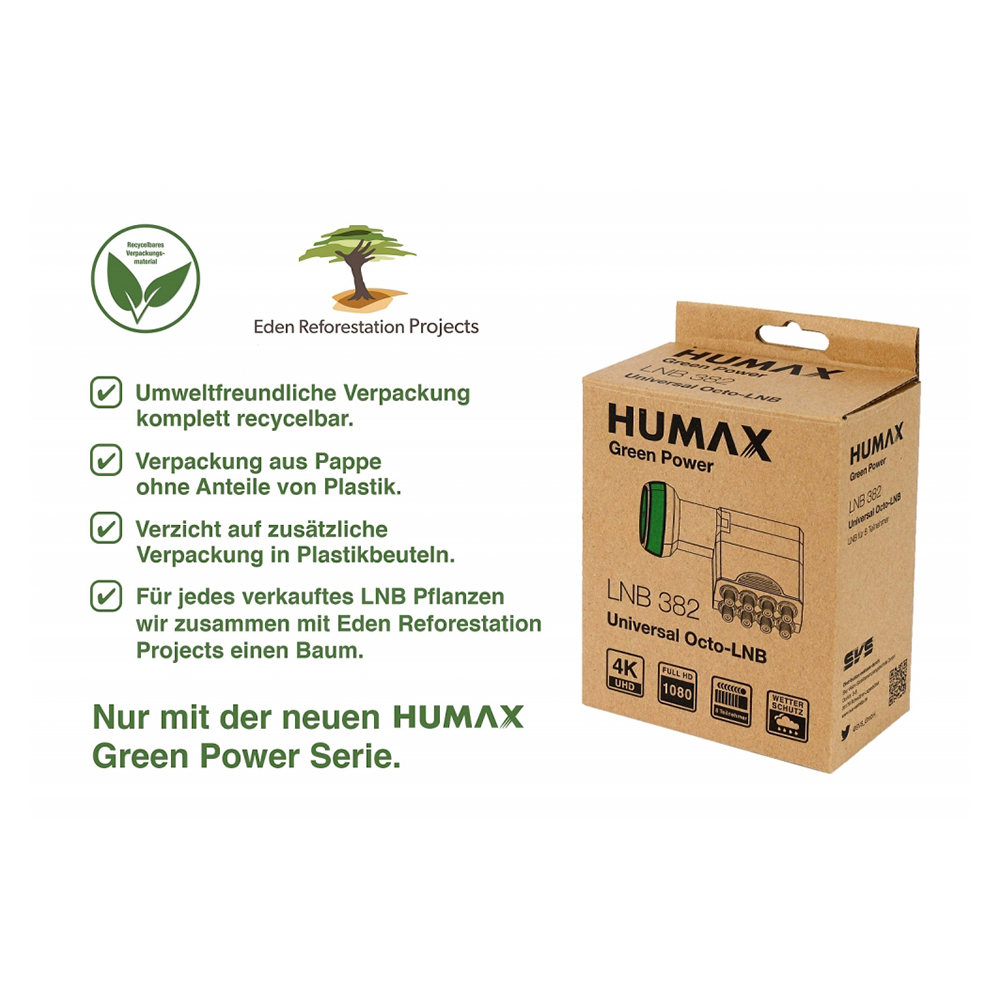 Green Power Octo Universal LNB 382. Die Humax Green Power LNB Series ist unsere umweltfreundlichste LNB Reihe, sie überzeugt mit ihrer erstklassigen Verarbeitung, dem Verzicht auf zusätzliche Plastik Verpackungen und seinen hervorragenden Empfangseigenschaften.