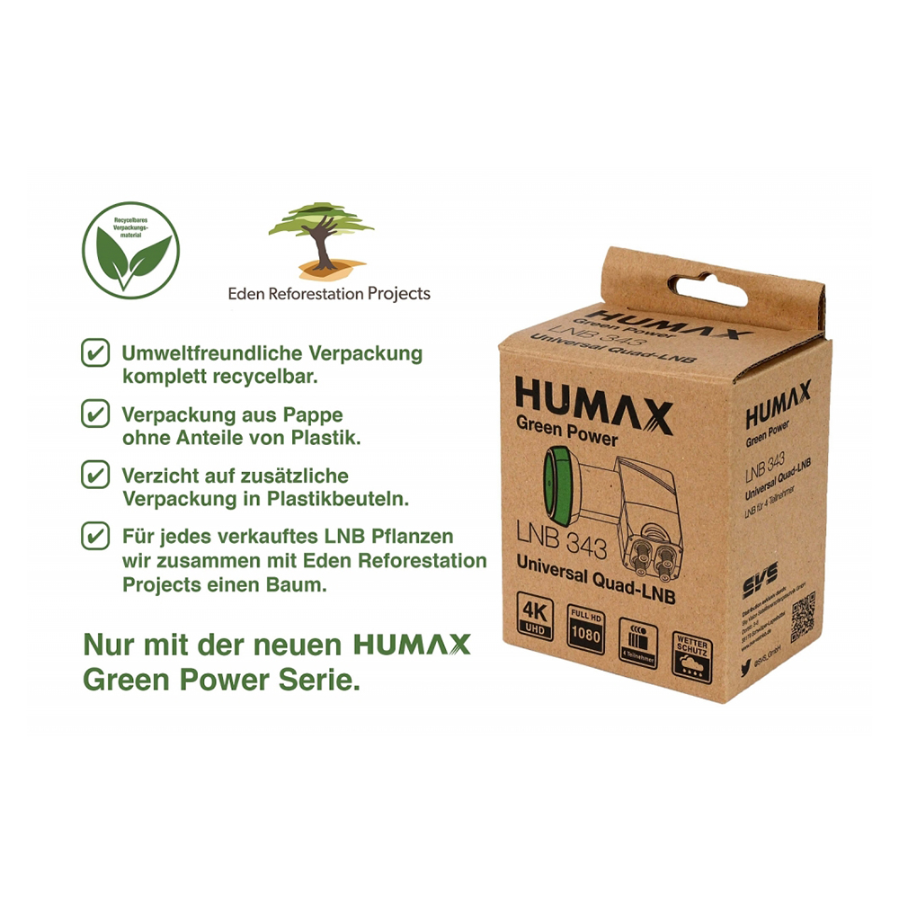 Green Power Quad Universal LNB 343 Die Humax Green Power LNB Series ist unsere umweltfreundlichste LNB Reihe, sie überzeugt mit ihrer erstklassigen Verarbeitung, dem Verzicht auf zusätzliche Plastik Verpackungen und seinen hervorragenden Empfangseigenschaften.