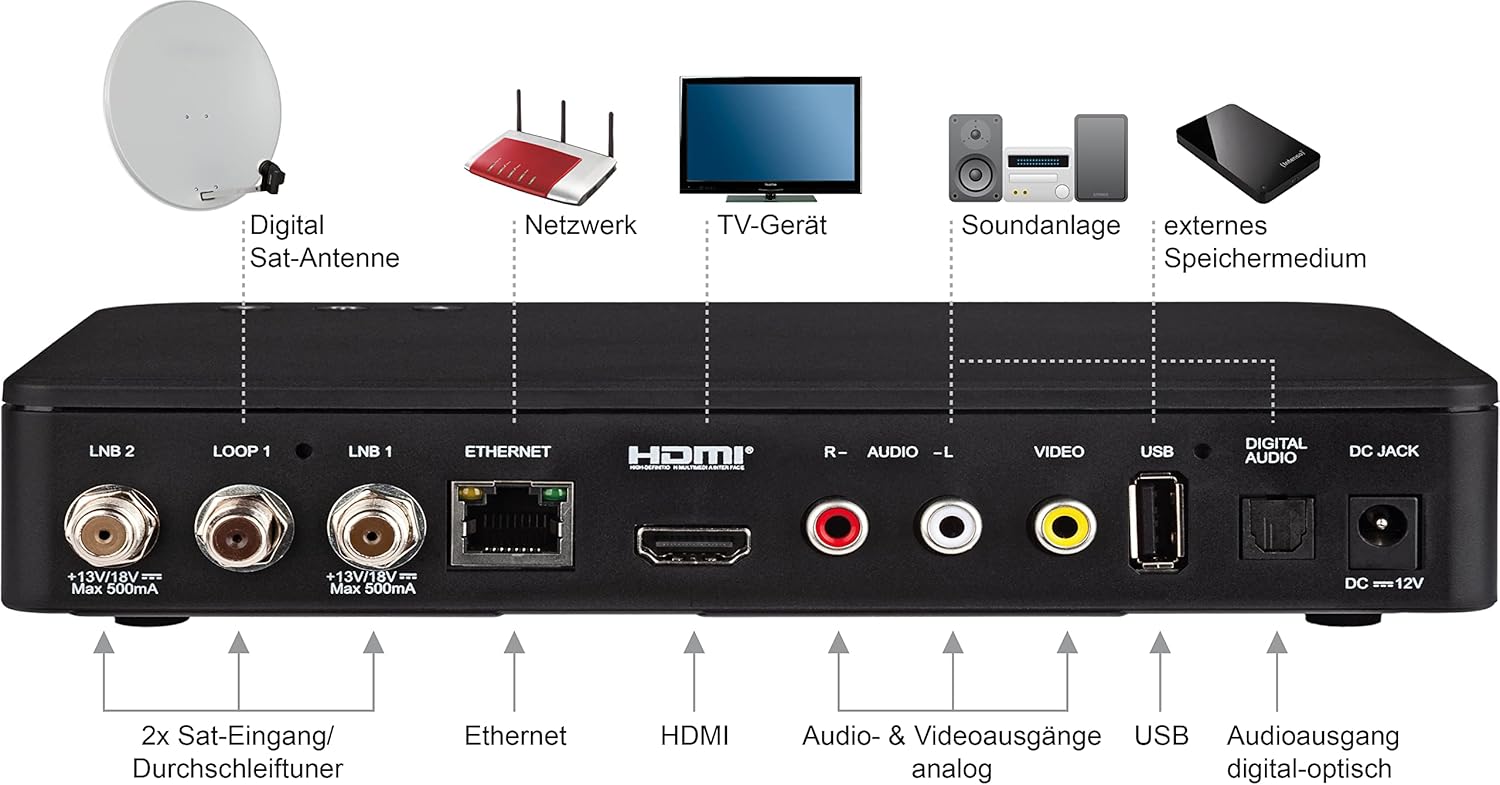 Der HD 7i Twin verfügt bietet eine große Anschlussvielfalt inkl. 2 ULB A Anschlüssen, sowie einen LAN Anschluss. Ein weiteres Highlight ist die Bluetooth Sende-Funktion, womit man den Ton per Bluetooth an einen Bluetooth Lautsprecher/Soundbar oder auch Kopfhörer übertragen kann. Verbunden mit einem Netzwerk bietet der Receiver Zugriff auf eine Vielzahl von Internetradiosendern, SAT IP Client & Server Funktionalität, ein YouTube Portal und mehr.