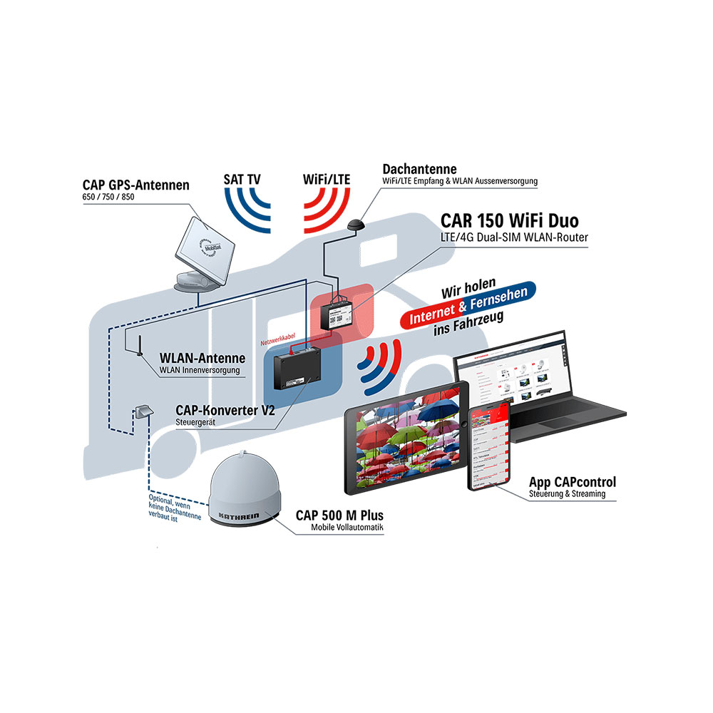 Receiver-unabhängige Dreheinheit HDP 650 GPS mit Flachantenne BAS 66 (Twin) und CAP-Konverter. Kompatibel mit jedem TV-Gerät oder Receiver mit Sat-Tuner. Live-TV auf mobile Endgeräte (Smartphone, Tablet) mit UFZ 131 (optional erhältlich)