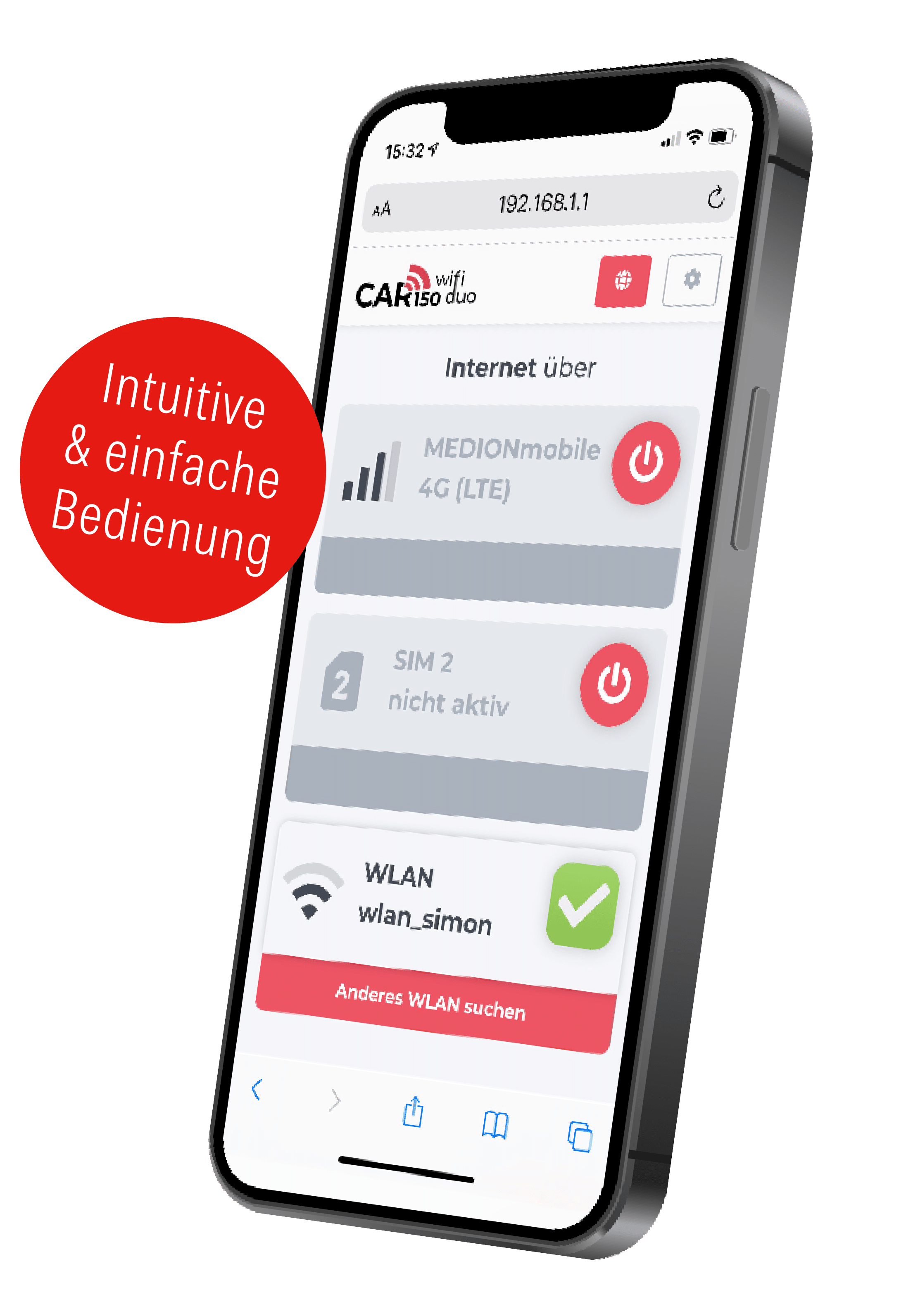Das CAR 4g LTE WLAN-Router-Set ermöglicht die Verbindung von mobilen Endgeräten (Handy, Tablet, Notebook) über ein bestehendes WLAN oder die mobilen Daten einer eingesteckten SIM-Karte mit dem Internet.
