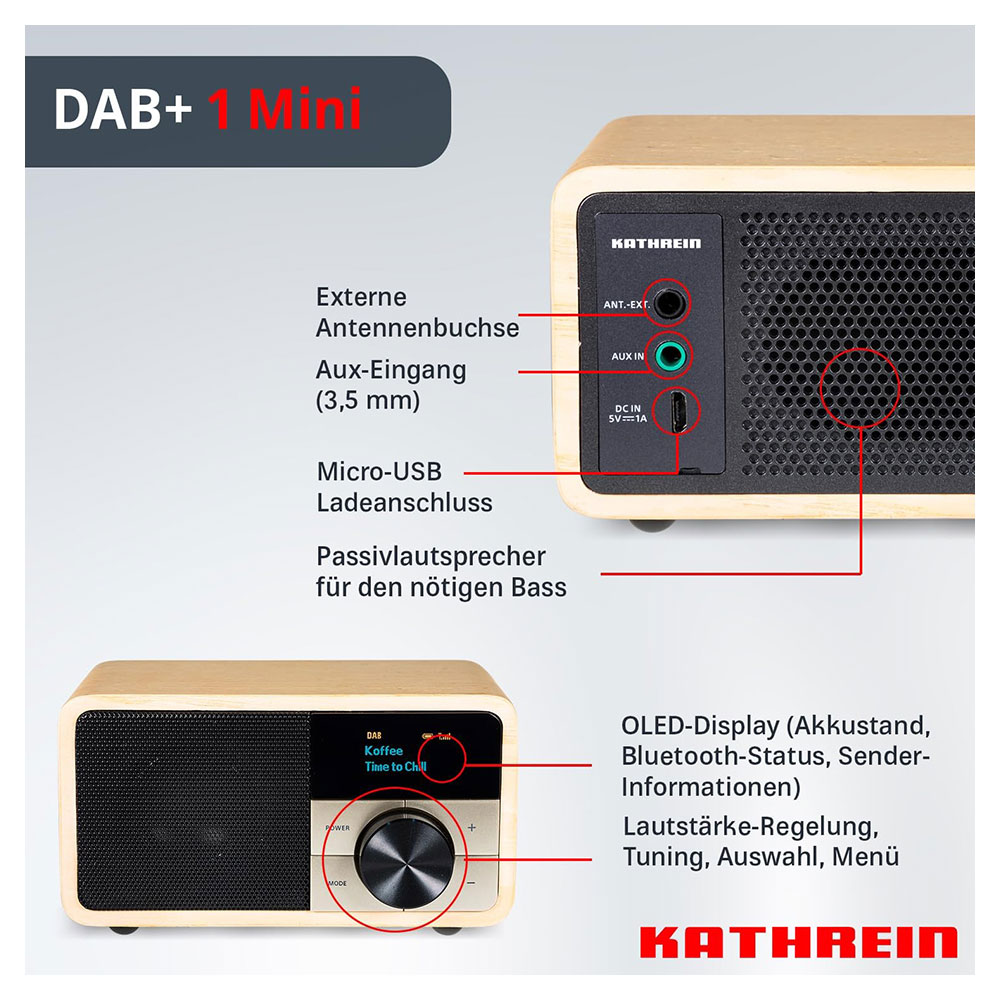 Produktinformationen "Kathrein DAB+ 1 mini Holz hell portables Radio DAB/UKW mit Akku 20 Stunden Streaming gebraucht"