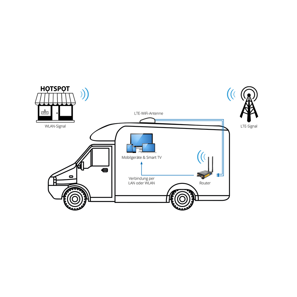 Bester Internet-Empfang für alle gängigen Mobilgeräte und Smart-TVs. Empfang von LTE- und WiFi-Signalen. Verstärkung der Signale ins Fahrzeuginnere.