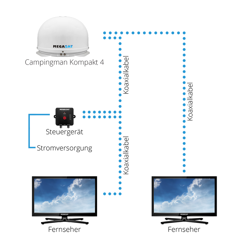 Im Mini-Steuergerät sind bereits 5 Satelliten programmiert. Zukünftige Transponder-Updates sind nicht notwendig.Die Satelliten-Antenne ist geeignet für zwei Teilnehmer und wird mit nur einem Koaxialkabel mit dem Steuergerät verbunden.