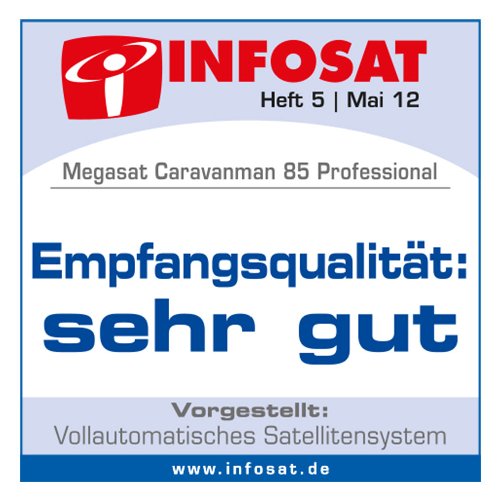 Der Caravanman 85 Professional ist der ideale Begleiter für alle, die in ganz Europa beste Radio- und Fernsehqualität genießen wollen. Der 85 cm große Spiegel sorgt für ideale Empfangsverhältnisse auch bei schwachen Satellitensignalen – und das in ganz Europa. Ein weiterer Pluspunkt ist die niedrige Aufbauhöhe von nur 19 cm im eingefahrenen Zustand. Diese ermöglicht eine Montage auch auf hohen Fahrzeugen, ohne die Durchfahrtshöhe erheblich zu beeinflussen. Die Ansteuerung erfolgt über ein im Lieferumfang enthaltenes Steuergerät, das auf Knopfdruck innerhalb kürzester Zeit den gewählten Satelliten vollautomatisch findet und für pures Fernsehvergnügen sorgt.