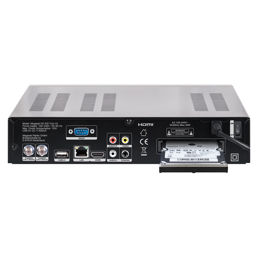 Mit dem zweiten Tuner-Eingang bietet der HD 935 Twin V3 die Möglichkeit zwei unterschiedliche Programme gleichzeitig zu verarbeiten. Während Sie eine Sendung aufnehmen, können Sie eine weitere unabhängig voneinander anschauen. Schließen Sie einfach ein zweites Koaxialkabel von Ihrem LNB an den Receiver an, und dem Komfort der Programmvielfalt steht nichts im Wege. Die Aufnahme erfolgt per USB über externe Speichermedien oder über den 2,5 Zoll Einschub mit einer geeigneten Festplatte.