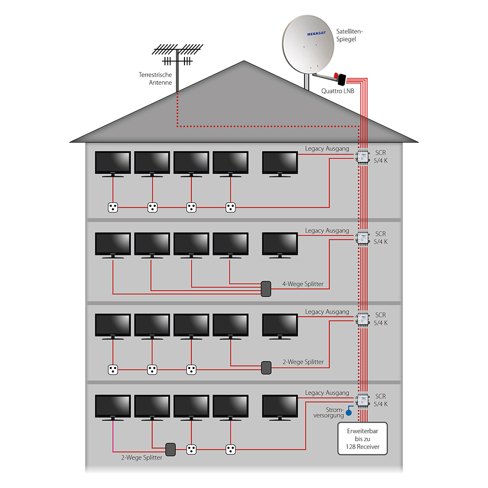 Höchste Bild- und Tonqualität durch geringste Dämpfung und hohe Entkopplung der Empfangsebene.Geringe Stromaufnahme durch modernste Netzteiltechnologie.Keine Einschränkung der Programmvielfalt. Erweiterbar auf bis zu 128 Receiver