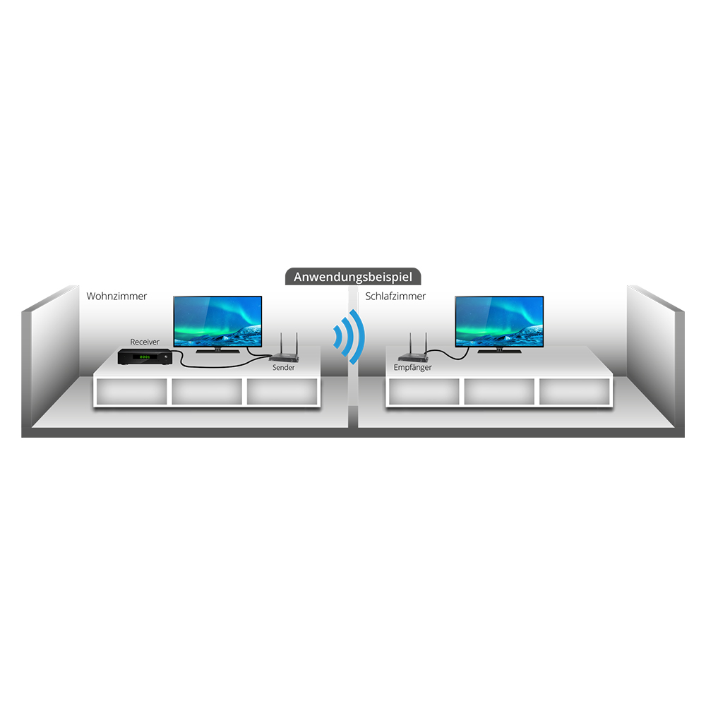 Drahtlose Full-HD Übertragung der Fernsehsignale in Ihrem Haus. Bis zu 200 Meter Reichweite zwischen Sender und Empfänger.
