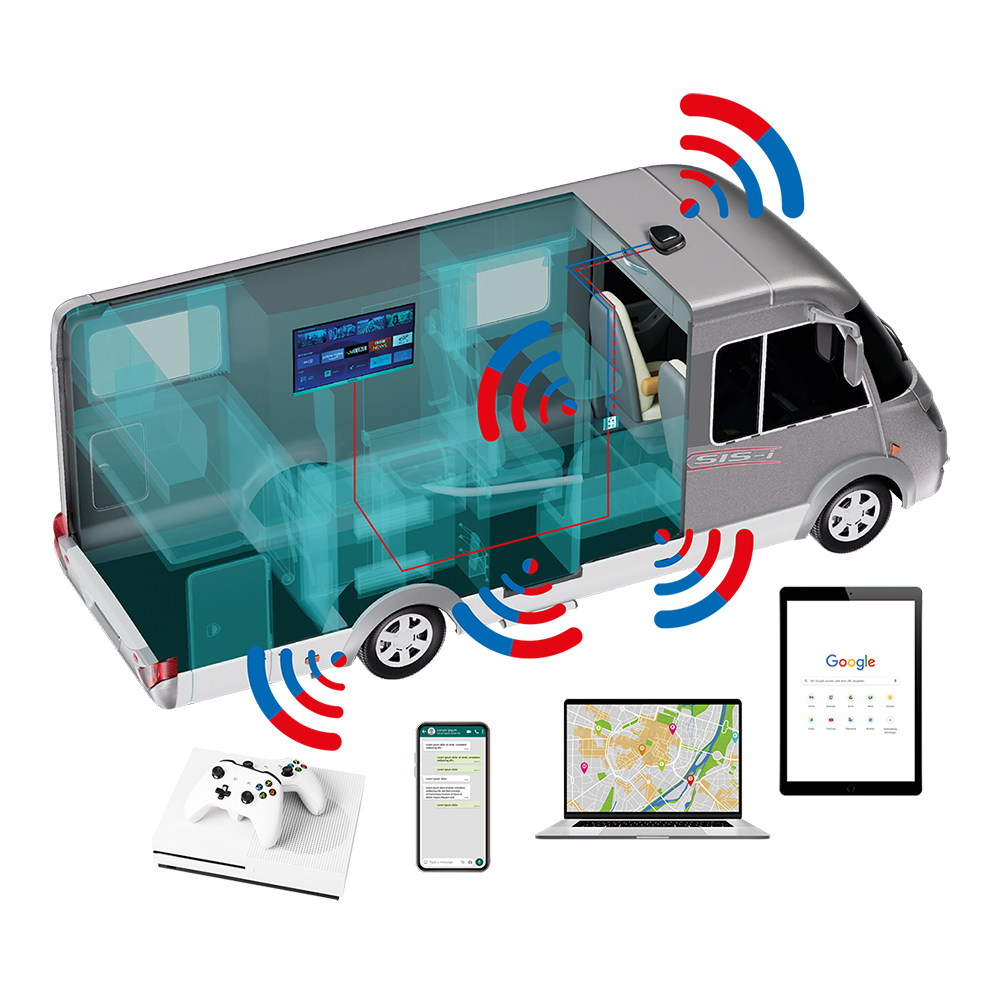 Verbinden Sie den WLAN-Router durch die Außenantenne mit dem WLAN-Netz des Camping- oder Stellplatzes oder mit dem Mobilfunknetz und nutzen Sie das von Ihrem WLAN-Router ausgesandte reichweitenstarke 2.4 GHz oder stabilere und schnellere 5 GHz WLAN-Signal, um mit Ihrem Smartphone oder Tablet im Internet zu surfen, eine elektronische Zeitung zu lesen oder mit Ihrem Smart-TV Fernsehgerät z. B. von Netflix, Amazon Prime, Disney+, YouTube oder den Mediatheken der Fernsehsender zu streamen.