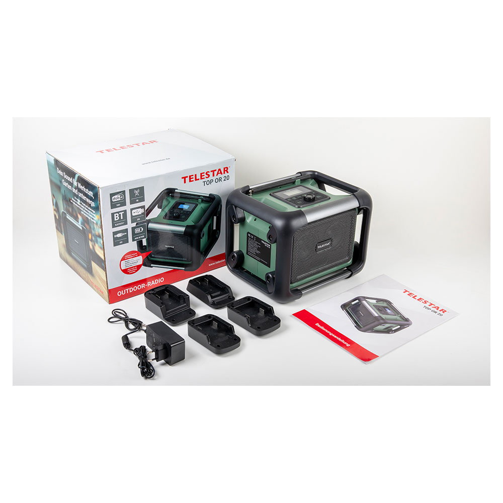 | Lieferumfang: | AUX-Audiokabel, Bedienungsanleitung, Externes 230 V Netzteil, TELESTAR TOP OR 20, Verschiedene Adapter für Akkupacks |