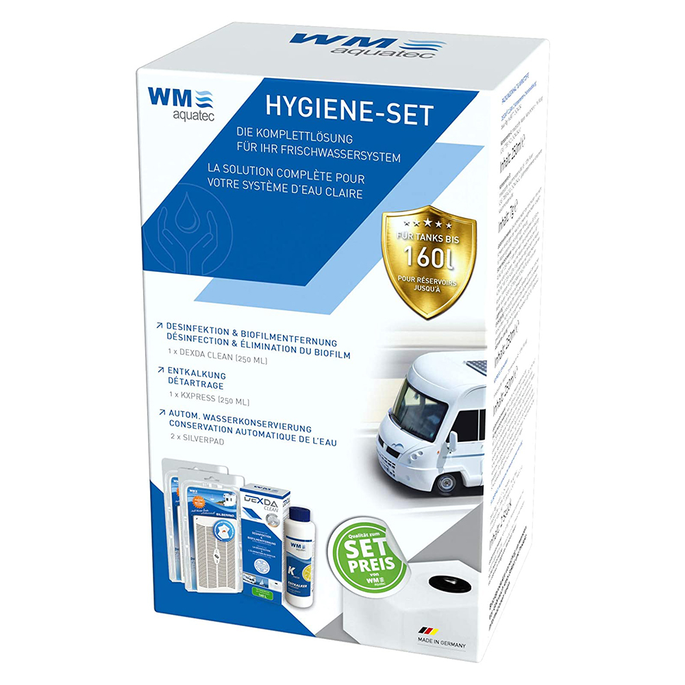 Das Hygiene-TRIO von WM aquatec ist ein Komplett-Set in Sachen Trinkwasserhygiene für ein ganzes Jahr. Es umfasst eine Reiniger-Kombination, bestehend aus DEXDA® Clean und KXpress (zur Reinigung, Biofilmentfernung, Entkalkung und Desinfektion) zur jährlichen Pflege des Frischwassersystems sowie das Silbernetz zur automatischen Wasserkonservierung.