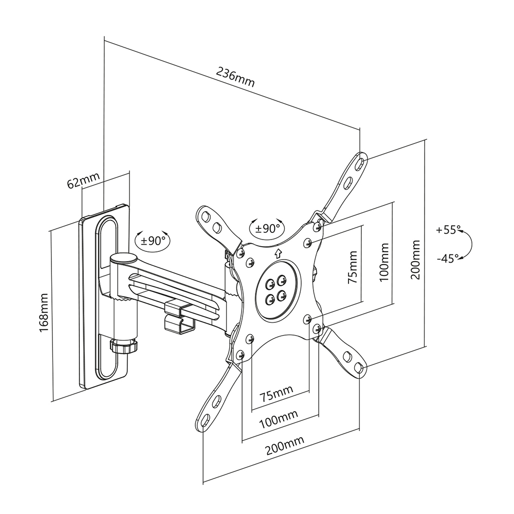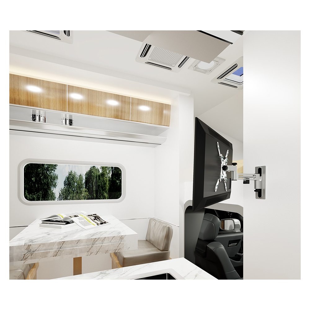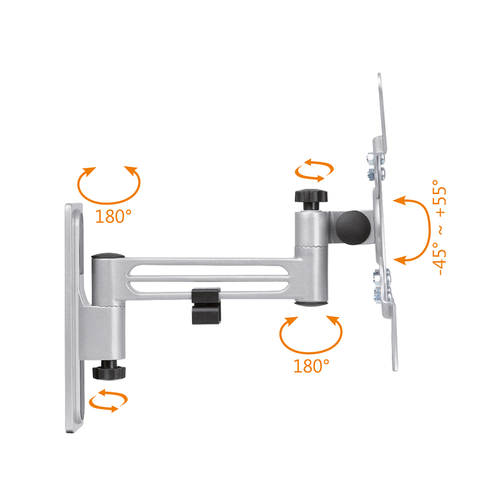 Die schwenkbare TV Halterung bietet mit ihren zwei Gelenken viel Flexibilität bei der Ausrichtung größerer Fernseher mit einer Bildschirmdiagonale von 13 - 43 Zoll (33 - 109 cm). So können Sie aus jedem Bereich Ihres Wohnmobils, Wohnwagens oder Campers die perfekte Sicht auf den Fernseher genießen.