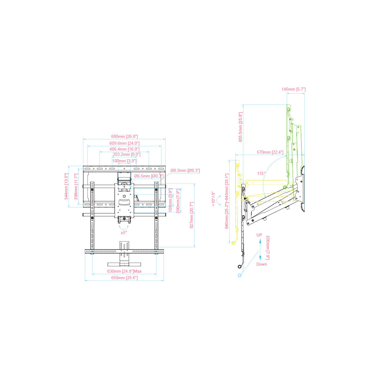 Die TV Halterung kann für Fernseher verschiedenster Hersteller mit einer Bildschirmdiagonalen von 42" - 65" (107 - 165 cm), einem VESA-Maß von 100 x 100 bis 600 x 500 mm und einem Gewicht von 8-25 kg verwendet werden. Die integrierte Gasdruckfeder kann dank einer gut ablesbaren Gewichtsskala exakt auf das jeweilige Gewicht des Fernsehers arretiert werden. Dadurch lässt sich der Bildschirm mit sanftem Druck auf die ideale Position einstellen.