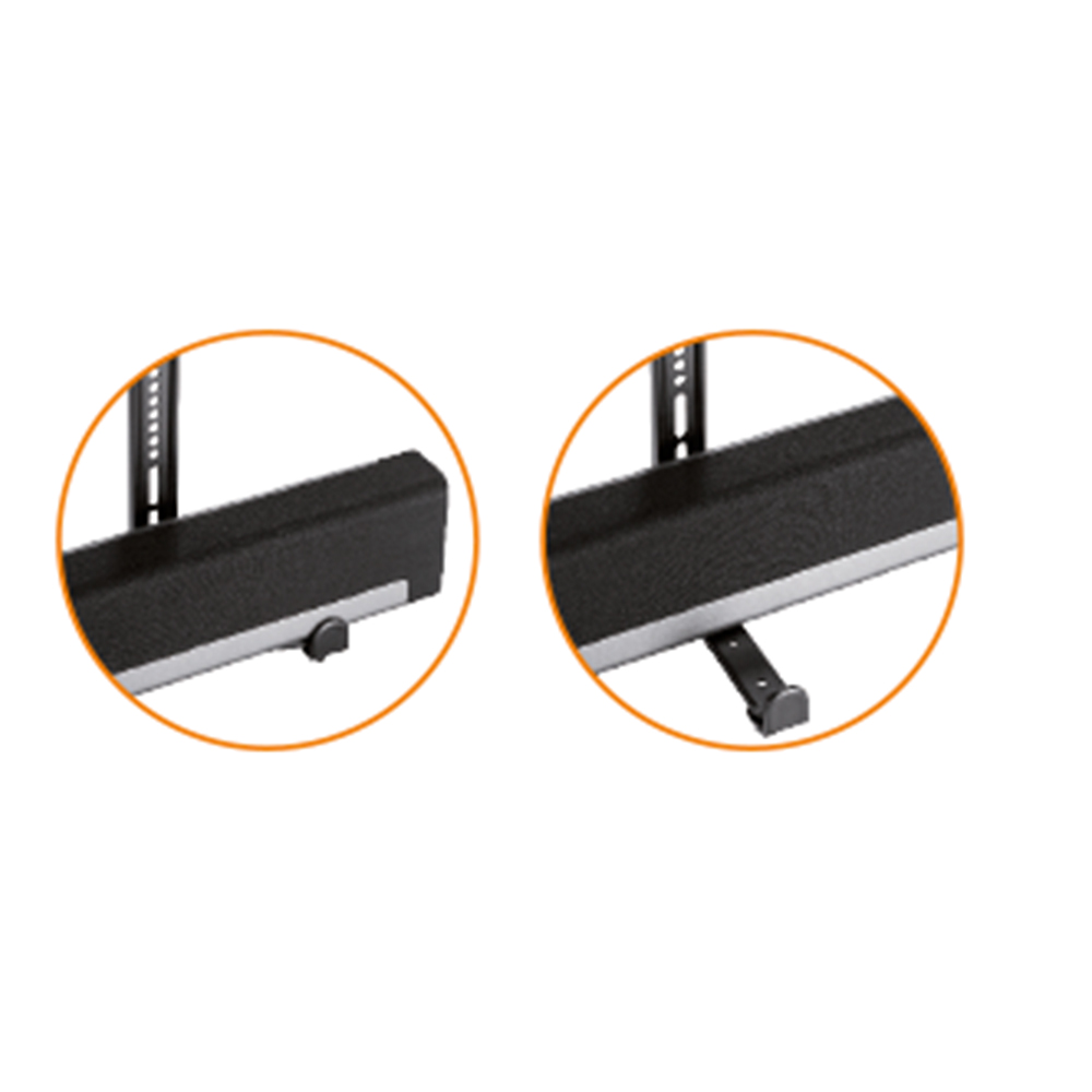 Die Halterung besteht aus reinem Stahl und bietet eine maximale Tragkraft von 15 kg. Ihre Soundbar ruht in einem rutschfesten Sockelhalter. Diese Konstruktion gewährleistet einen sicheren Halt und verhindert, dass die Soundbar umkippt, wenn die Halterung geneigt wird.