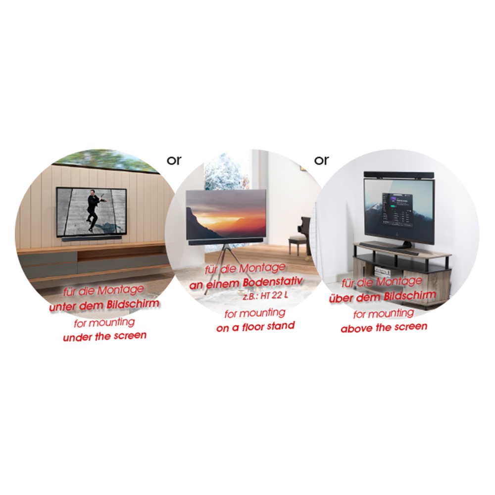 Sie können dabei die Soundbar über oder unter dem Fernseher befestigen. Und das Gute: Ihre Soundbar macht jede Bewegung Ihres Fernseher mit. Der Klang bleibt dadurch immer im Fokus des Bildgeschehens. Einfache und schnelle Montage an den meisten Wandhaltern ist garantiert.
