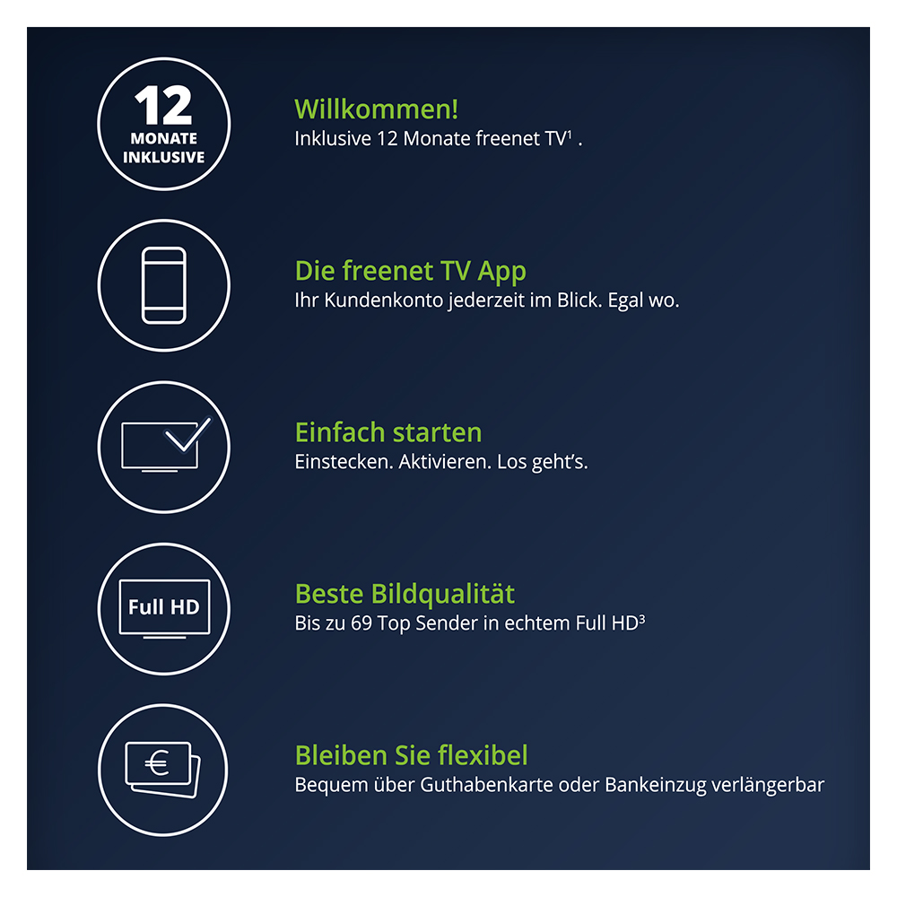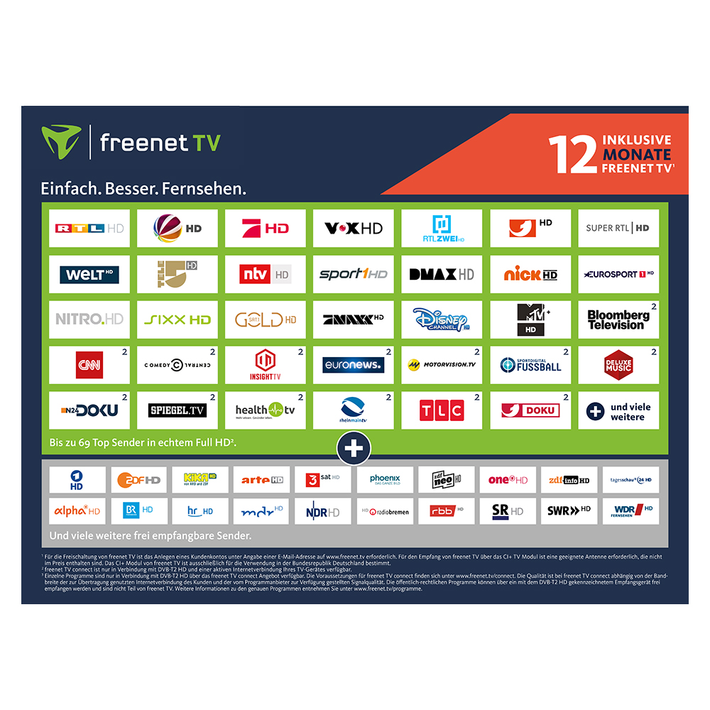 *Für die Freischaltung von freenet TV ist das Anlegen eines Kundenkontos unter Angabe einer E-Mail-Adresse auf www.freenet.tv erforderlich. Fürden Empfang von freenet TV über das CI+ TV Modul sind eine geeignete Antenne bzw. Satellitenschüssel erforderlich, die nicht im Preis enthalten sind. Das CI+ Modul von freenet TV ist ausschließlich für die Verwendung in der Bundesrepublik Deutschland bestimmt.