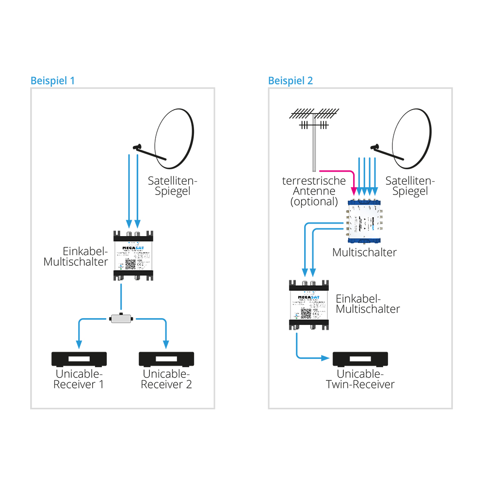 Der Einkabel-Multischalter dient als Erweiterung der bestehenden Satelliten-Anlage. Er wandelt eine bestehende Koaxialleitung in eine Twin- oder Zwei-Teilnehmer-Koaxialleitung. Der Einkabel-Multischalter wird an zwei freie Satelliteneingänge angeschlossen (z. B. Twin-LNB, Quad-LNB oder Multischalter). Er generiert aus den beiden Signalen zwei Unicable-Frequenzen und ermöglicht somit den Twin- oder Zwei-Teilnehmer-Betrieb über eine bestehende Koaxialleitung. Alternativ ist auch mit der unterstützten DiSEqC-Schaltung der Betrieb mit zwei Satelliten möglich (z. B. Astra / Hotbird).