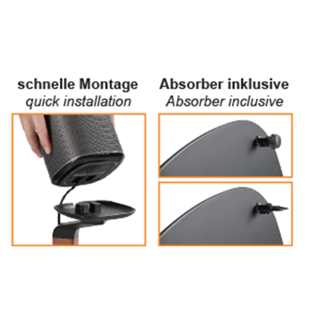 Maximaler Hörgenuss von TON und Bild. Zur Vervollständigung Ihres Wohnzimmers gibt es die Lautsprecherständer auch für SONOS Boxen im mywall Design der EXTRAKLASSE. Das besondere hier sind die mitgelieferten Spikes, welche eine optimale Entkopplung zum Fußboden ermöglichen. Oder Sie verwenden die ebenfalls beigefügten Polymerabsorber. Die mit Moosgummi bezogenen Boxenstandflächen bestechen nicht nur durch eine edle Optik sondern sorgen dadurch auch für den sicheren Halt Ihrer Lieblingsboxen.